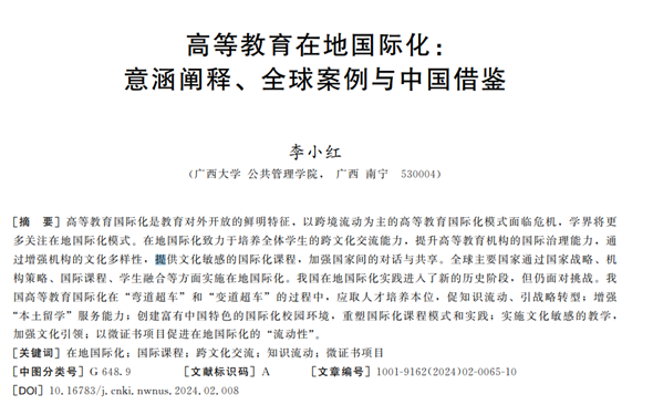 近日,太阳成集团tyc副教授李小红在《西北师大学报(社会科学版)》发表论文“高等教育在地国际化:意涵阐释、全球案例与中国借鉴”,对高等教育意涵及在全球范围内的经典案例进行了解读,探讨了高等教育在地国际化的实践策略和中国路径。