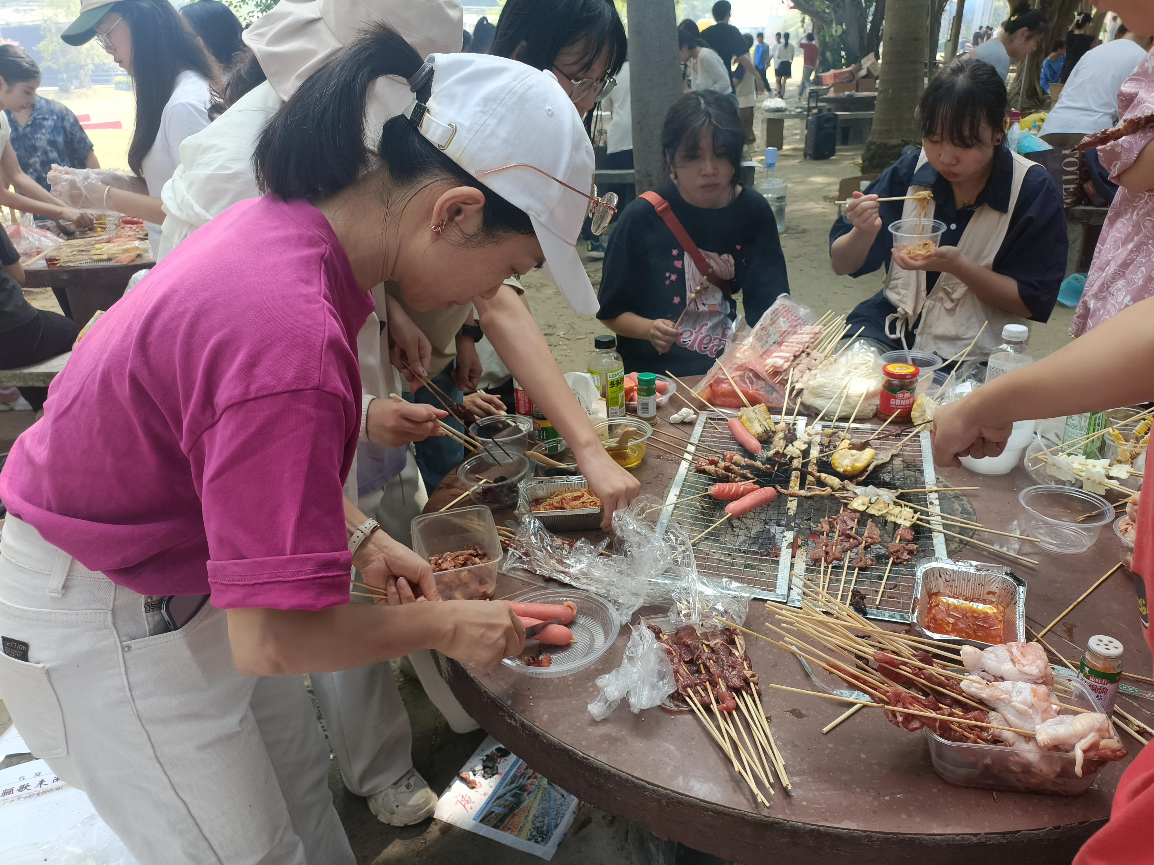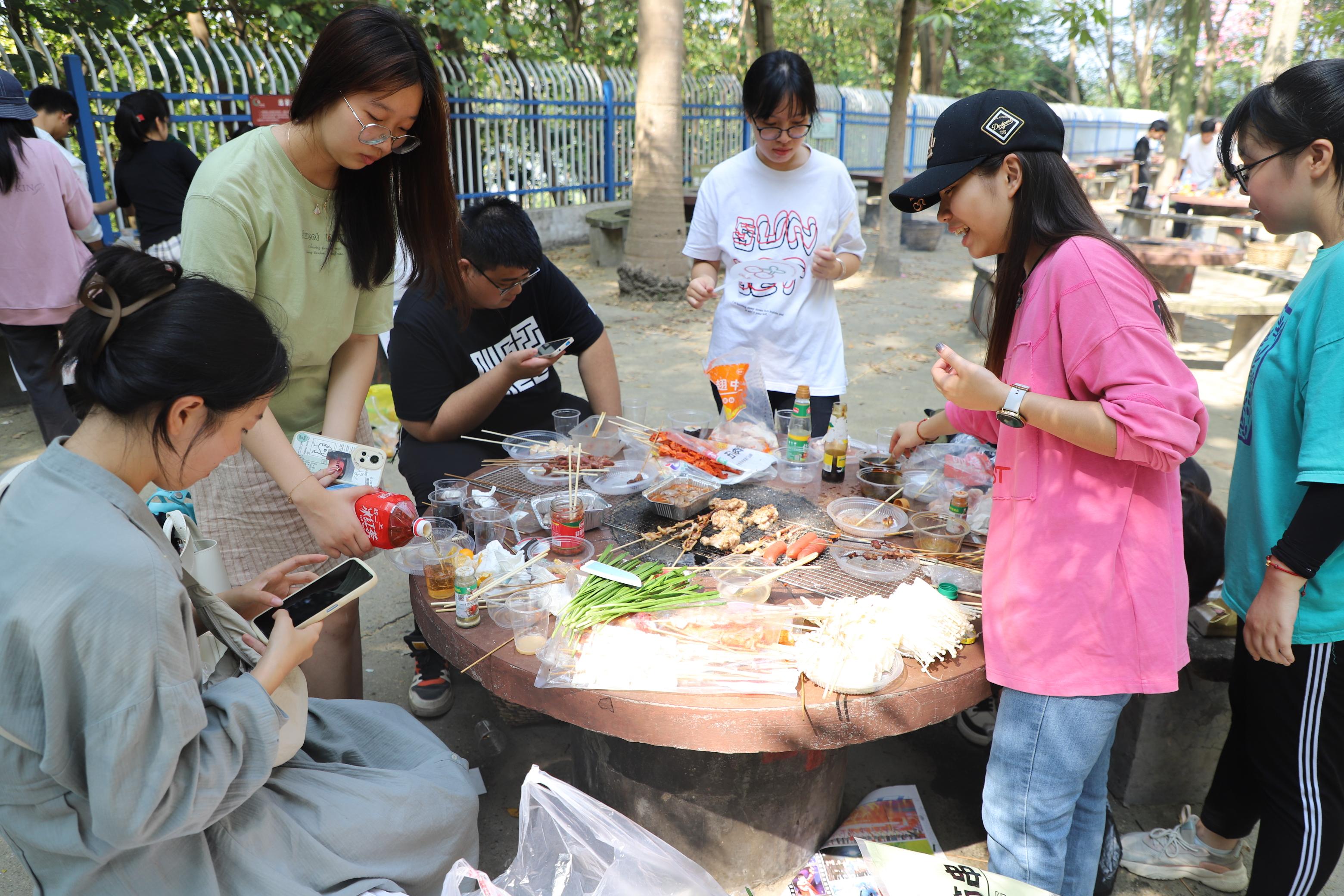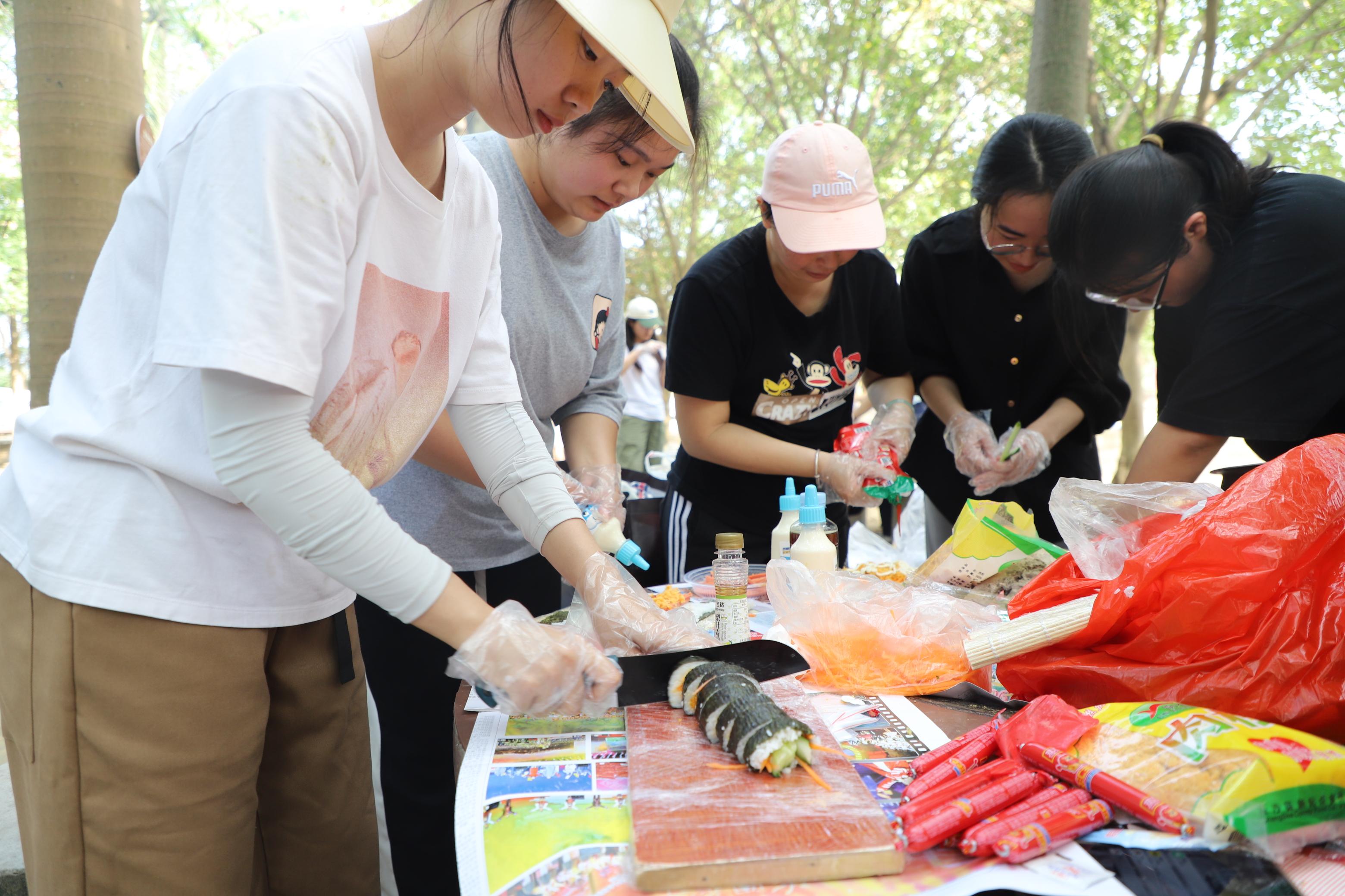 打水、洗菜、串肉、烧烤,同学们忙的不亦乐乎……老师们也加入了这场户外盛宴,庞惠老师亲手给大家烤制了美味的香肠,黄文静老师带领团委员工会干部一起卷寿司,刘佩瑶老师帮助大家处理食材,侯俊丽老师与同学们亲切交谈关心大家的学习生活。在老师的帮助与大家的努力下,同学们最终都吃到了自己精心烤制的食物,更是体会到互帮互助、团队合作的重要性。