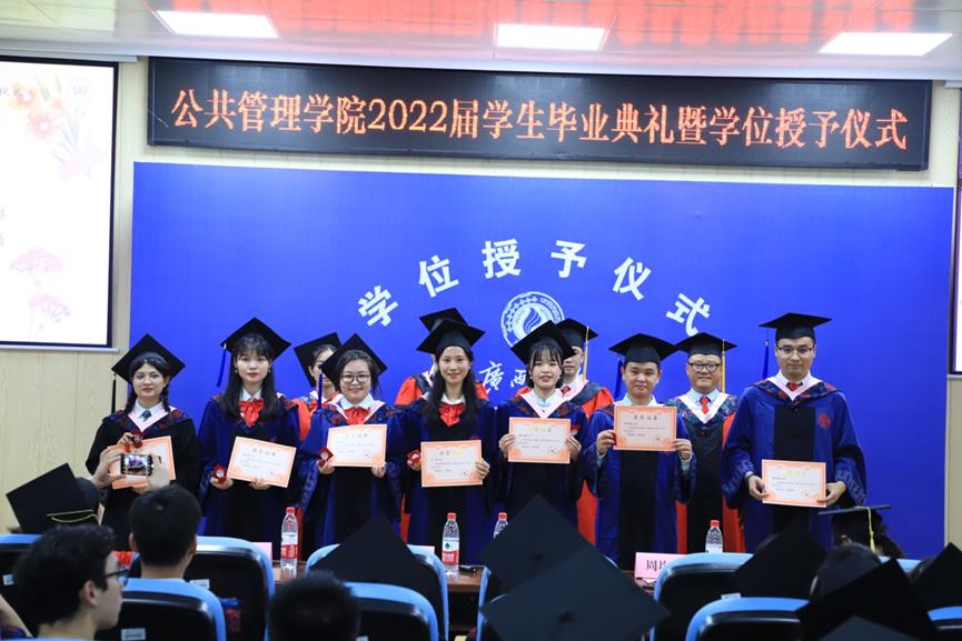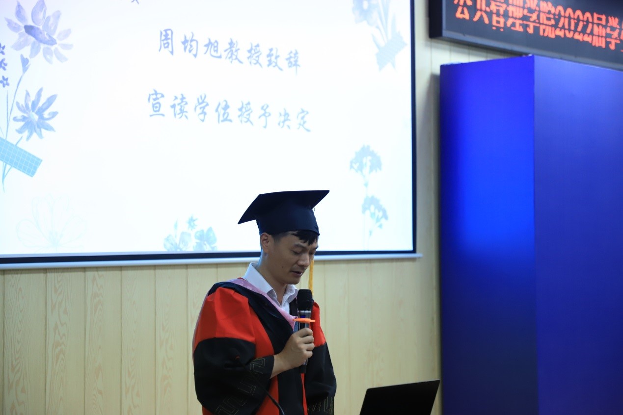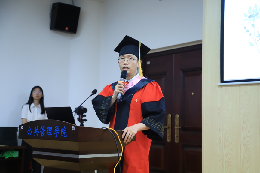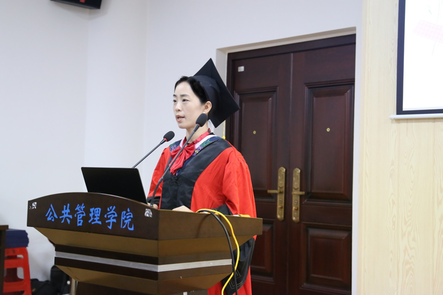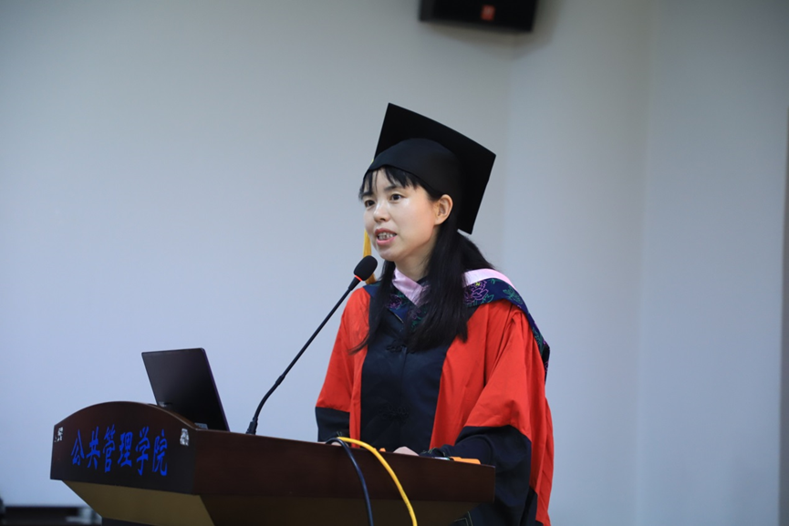 教师代表李小红副教授、学硕毕业生代表蒋文倩、专硕毕业生代表言天磊、本科生毕业生代表文颖、及在校生代表唐正昌上台发言。李小红首先向同学们道一声感谢,公司公共管理事业管理专业在2022年软科中国大学专业排名的提升离不开师生的共同努力。其次祝贺同学们顺利毕业,取得阶段性圆满。在进入下一阶段之前,可能会存在激动、期待、紧张和无措的情绪,但是希望大家能在当下细细回想老师、同学们的教导与陪伴,这些将会是你们不惧困难的力量。李小红以浙江大学高中山教授的经历告诉我们在学术追求的道路上,不应仅仅只有爱好和喜欢,更多的是要责任和担当。希望我们每个公管人在日后的工作和学习中,都能挑起重担,在面临困难时都能够坚持不懈。同时也欢迎同学们在想念母校的时候,能够常回母校看看,老师们也会想念大家。