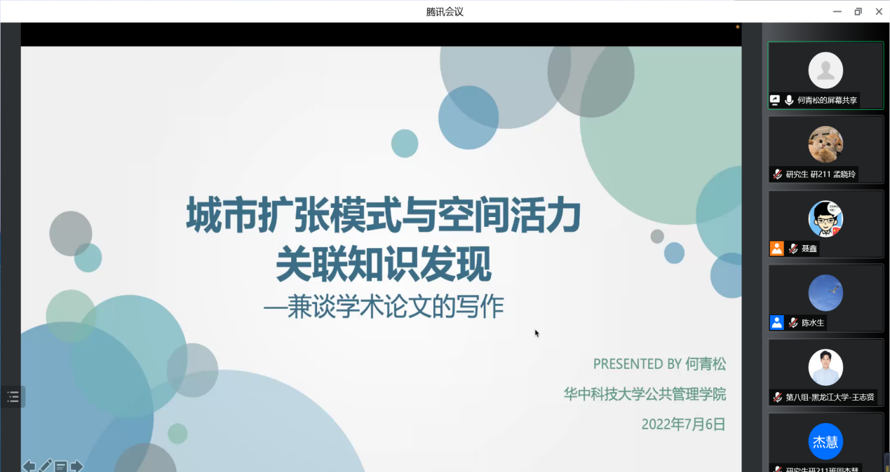 6日,公司举行了三场学术讲座,讲座以线上会议的形式举行,分别邀请了复旦大学教授陈水生、华中科技大学研究员何青松、浙江大学研究员吴佳雨作主题为《行政管理的学科发展及学习规划建议》、《城市扩张模式与空间活力关联知识发现—兼谈学术论文的写作》、《城市绿色空间治理》的分享,公司党委书记聂鑫教授主持会议,全体夏令营营员及公司多名老师、研究生参加本次学术讲座。
