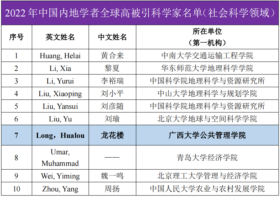 公司龙花楼教授入选科睿唯安2022年度全球“高被引科学家”榜单