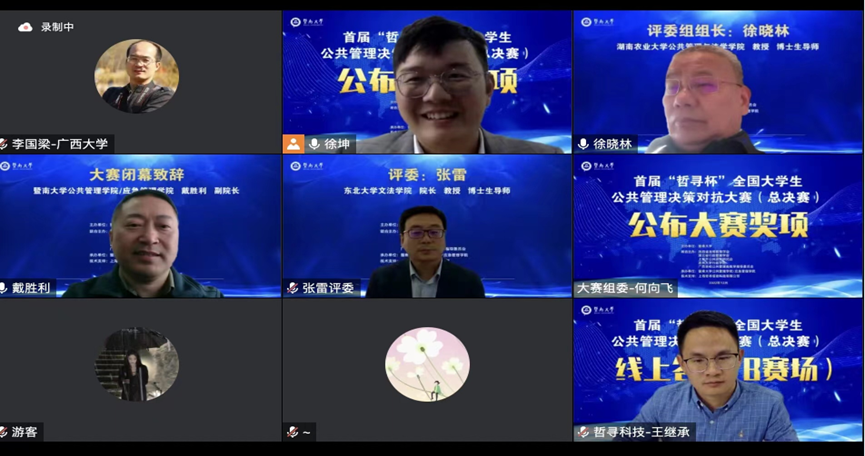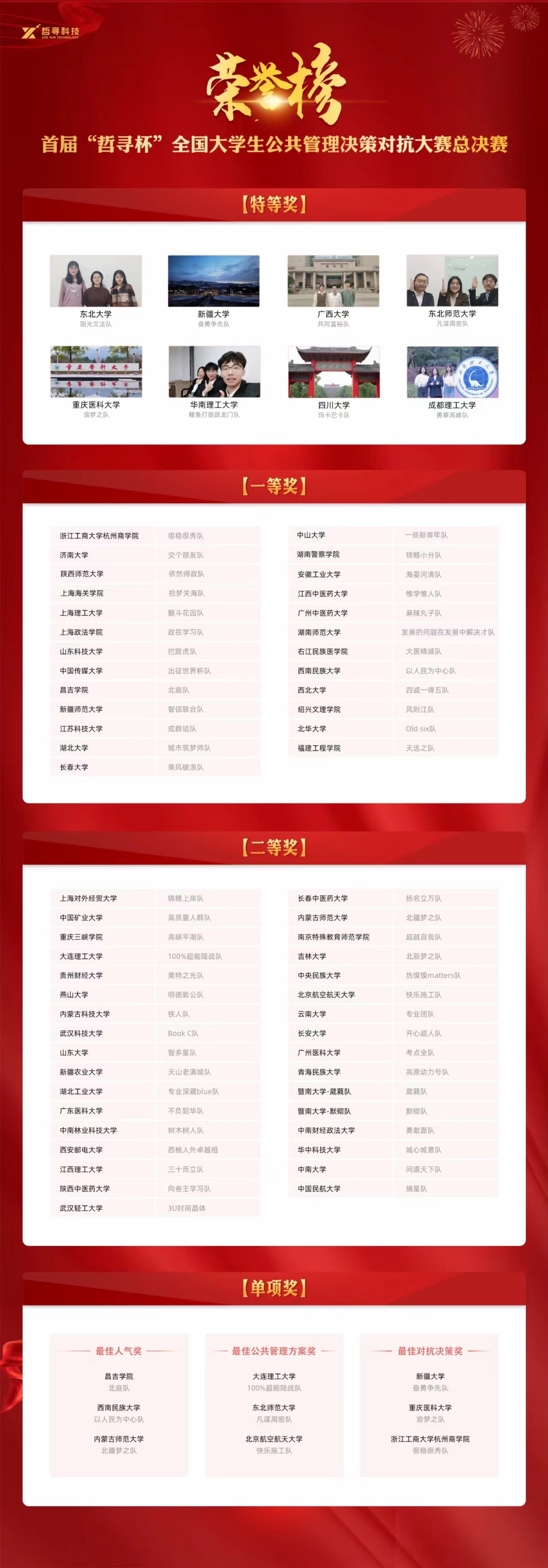 2022年12月4日,首届“哲寻杯”全国老员工公共管理决策对抗大赛总决赛(以下简称“大赛”)顺利落下帷幕,公司李国梁副教授带领公共事业管理专业2019级员工姚俊宇、蒙清璇、辛鲁宁三人组成的“共同富裕”队参加比赛,最终斩获全国总决赛特等奖。