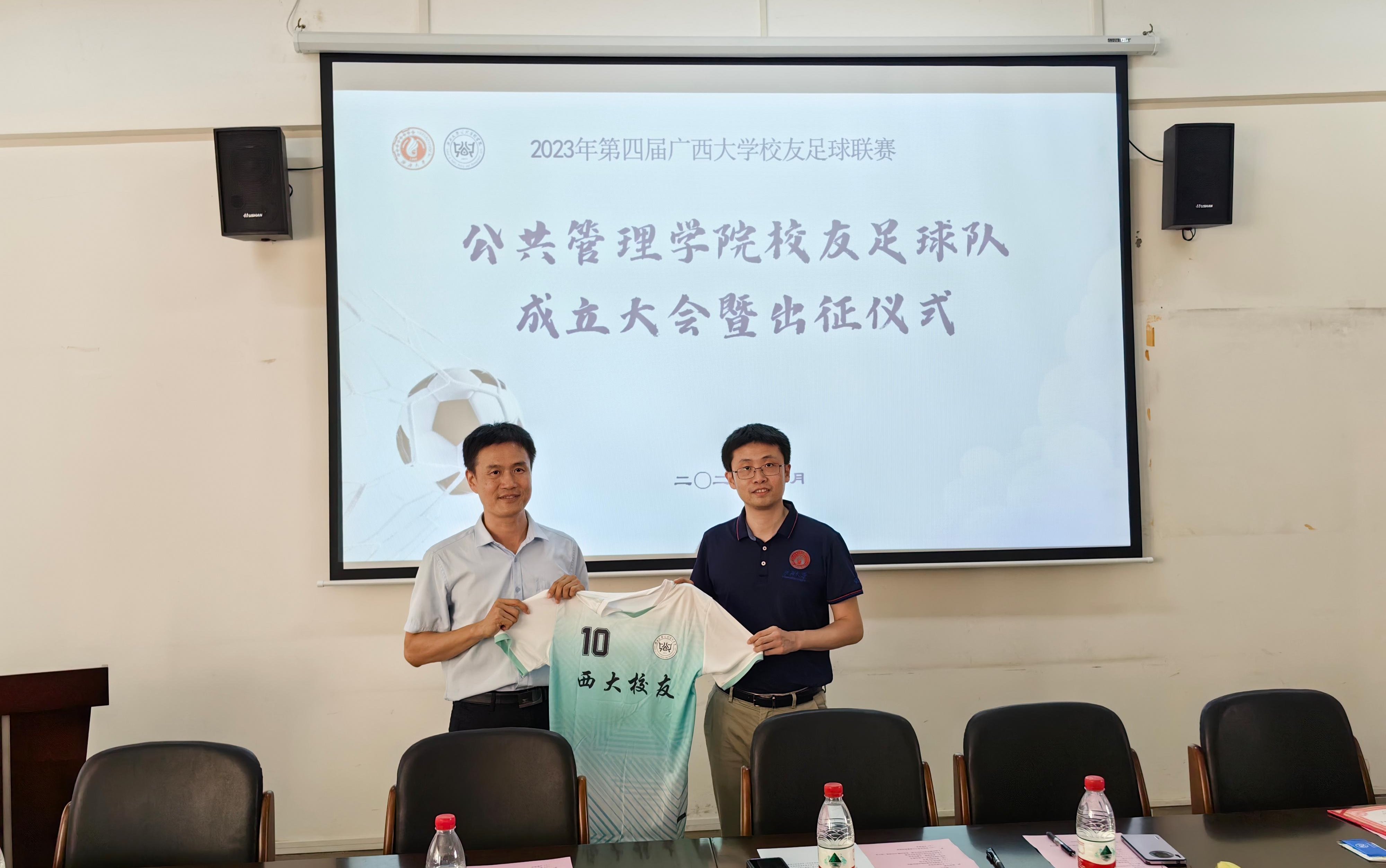 现就职于广西财经公司就业指导中心的员工代表哲学97级吴仕宇,就球队组建、球队组织构架、队员具体情况分别进行了介绍。他用三个起于和成在总结了球队组建的过程,即“起于兴趣,成在管理;起于初心,成在传承;起于跬步,成在千里”,表达了公共管理学子将专业培育的思维、知识和品质更好运用于社会,融入生活的态度。