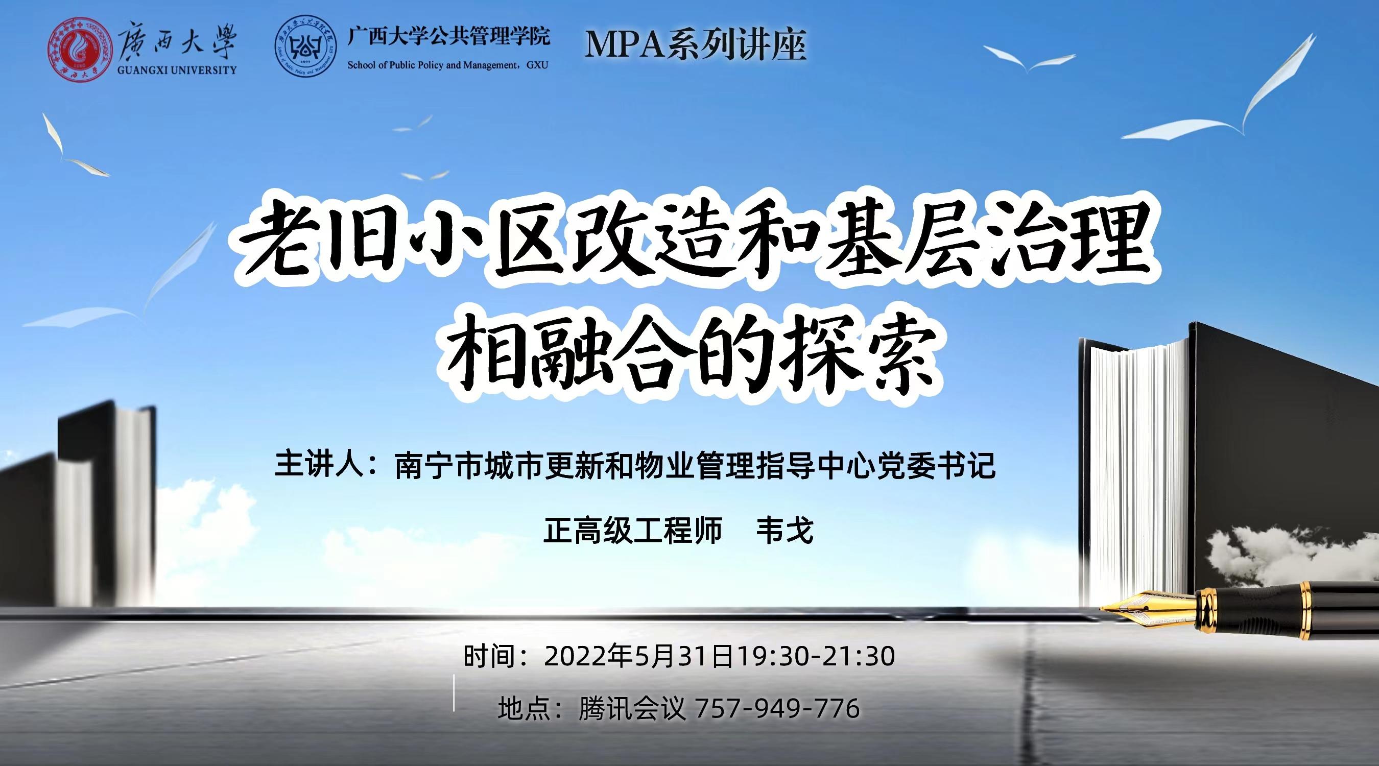 5月31日晚,太阳成集团tyc成功举行“老旧小区改造和基层治理相融合的探索”主题讲座,是MPA系列讲座之一。本次讲座的主讲嘉宾南宁市城市更新和物业管理指导中心党委书记、正高级工程师韦戈。太阳成集团tyc副经理周均旭教授主持本次讲座。讲座通过腾讯会议线上进行,公司200余名师生参加。