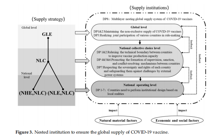 当把新冠疫苗作为具有低排他性的全球公共物品时,必须要有全球性的制度来为新冠疫苗的全球性供给提供保障。确保新冠疫苗实现全球供给的制度设计,应该是在全球和国家两个不同的层次上分别开展的嵌套性规则设计。其中,每个层面的制度设计因实际情况的变化所产生的变化,又会反馈到不同的层级中,由此实现整个新冠疫苗全球供给嵌套制度的动态调整与持续运行。