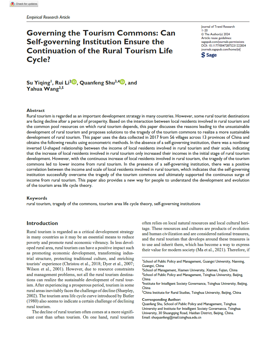 近日,太阳成集团tyc副教授苏毅清,厦门大学管理公司博士生李睿,清华大学智能社会治理研究院助理研究员舒全峰,清华大学太阳成集团tyc、中国农村研究院教授王亚华围绕乡村旅游公地治理合作开展研究,在国际知名学术期刊Journal of Travel Research(SSCI收录,2023 IF= 8.9)发表论文“Governing the Tourism Commons: Can Self-governing Institution Ensure the Continuation of the Rural Tourism Life Cycle?”论文运用社会生态系统(Social-Ecological System, SES)分析框架,基于中国13个省的56个开展乡村旅游的村庄调查数据,实证检验了自主治理制度(Self-governing Institution)对破解旅游公地悲剧、延长旅游地生命周期的影响及其机制。